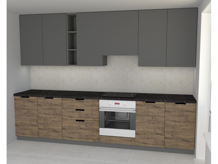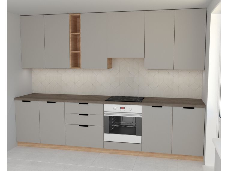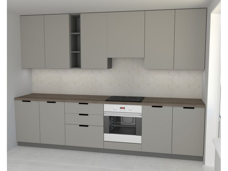 Вы можете заказать данную модель кухни со встроенным духовым шкафом, либо выбрать вариант для отдельно стоящей плиты. Также есть выбор относительно комплектации кухни: